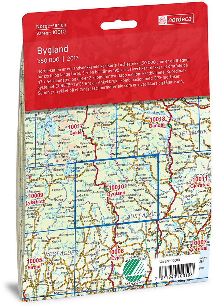 Norge-serien 1:50 000 er et nytt kart i plast, bygget for aktivt friluftsliv. Kartene er velegnet til tur- og fritidsbruk på fjellet, i skogen, langs kysten og til jakt og fiske. For profesjonelle virksomheter gir Norge-serien nødvendig kunnskap om terreng og geografi for planlegging og utøvelse. Alle de 195 kartene i er trykket på et tynt materiale (Tyvek) som tåler vann og er vanskelig å rive i stykker. Norge serien kart tåler store fysiske påkjenninger og vil være et perfekt kart for tur i all slags vær.