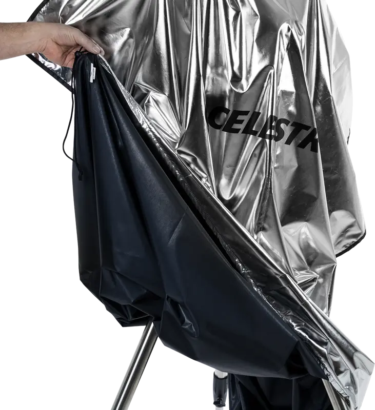 Det sølvfargede ytterlaget er laget av aluminiumslaminert stoff og reflekterer sollys for å holde utstyret kjølig om dagen og isolert om natten, noe som bidrar til å opprettholde en stabil innvendig temperatur. Innvendig gir det myke 210D polyesterfôret en beskyttende barriere for teleskopets finish. En innebygd snøring i cinch-stil gjør at du kan feste dekselet på plass. Avhengig av oppsettet ditt kan du justere høyden på dekselet for å få en tilpasset passform – det stenger vind, støv og lett fuktighet ute samtidig som det holder alt beskyttet og stabilt.