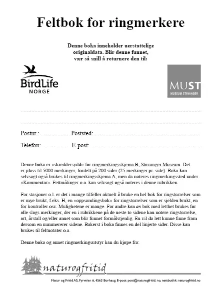 Boka er laget og utformet mest mulig hensiktsmessig som notatbok for ringmerking. Det er plass til 25 merkinger på hver side og 5.000 i hele boka. Omslaget er striebundet, og står for en støyt, selv om boka ikke er laget i vannfast papir.