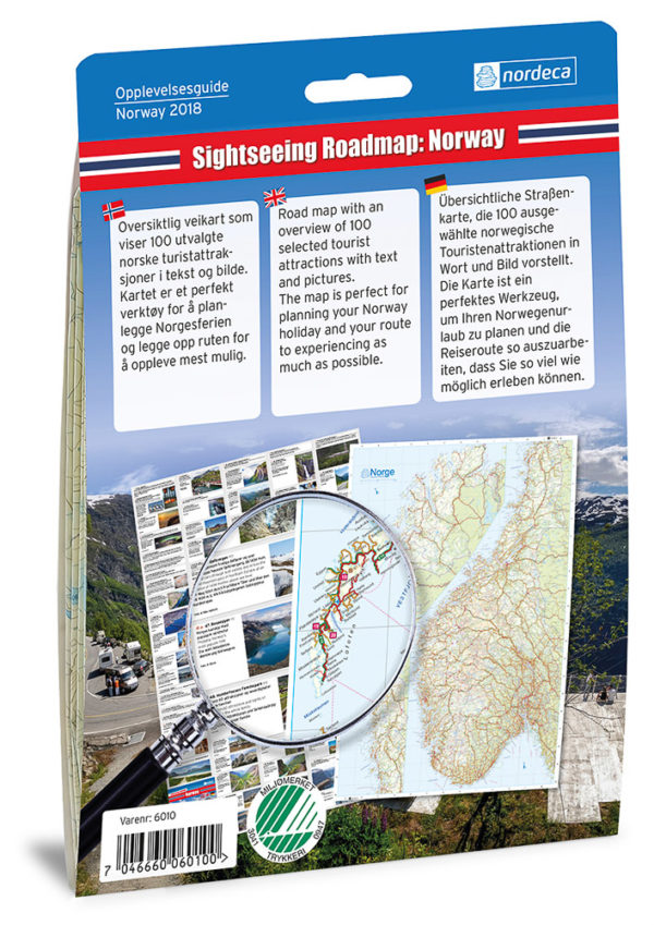Opplevelsesguide Norway viser veien til 100 utvalgte norske attraksjoner i Norge, inntegnet på vårt populære Norgeskart i 1:1 000 000.