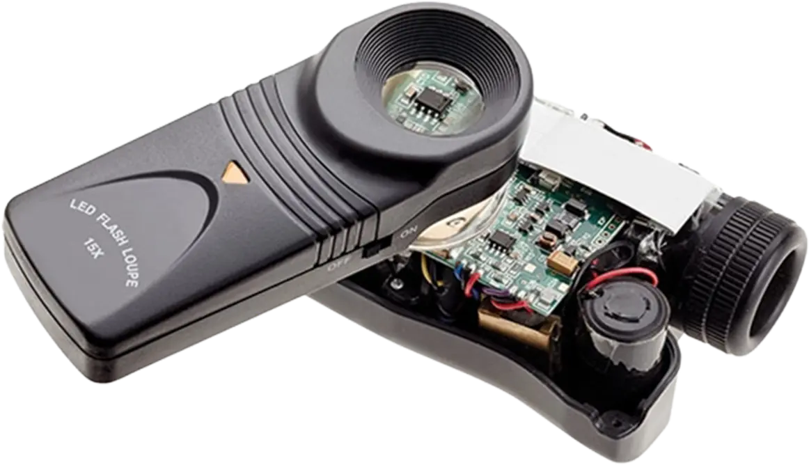 Håndholdt lupe med glasslinse og LED-lys. Glimrende hjelpemiddel for gullsmeder, sølvsmeder og andre som vil lese stemplene på gull- og sølvgjenstander. Populær blant botanikere for å studere detaljer på moser og lav.