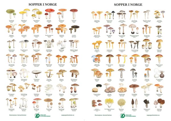 Grønnkremle, mild gulkremle, skarp gulkremle, storkremle, gulrød kremle, nøttekremle, skjeggriske, furumatriske, granmatriske, rødbrun pepperriske, mandelriske, svartriske, gallesusserong, grå jordmusserong, kransmusserong, grå blekksopp, matblekksopp, kaffebrun traktsopp, stor kragesopp, rimsopp, rødbelteslørsopp, blåbelteslørsopp, butt giftslørsopp, spiss giftslørsopp, sjampinjonger, giftsjampinjong, veisjampinjong, vintersopp, pluggsopp, fløyelspluggsopp, honningsopper, stubbeskjellsopp, flatklokkehatt, bjørkeøsterssopp, vårfagerhatt, rødnende fluesopp, kamfluesopper, hvit fluesopp, rød fluesopp, brunfluesopp, panserfluesopp og grønn fluesopp.