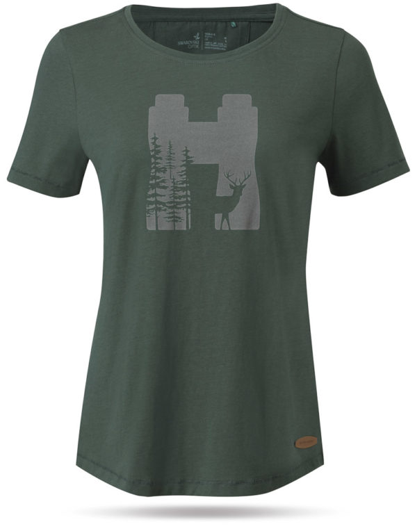 Swarovski T-skjorten er laget i 100% organisk bomull. Den er grønn og har trykk i front med en kikkert i grått og en hjort.