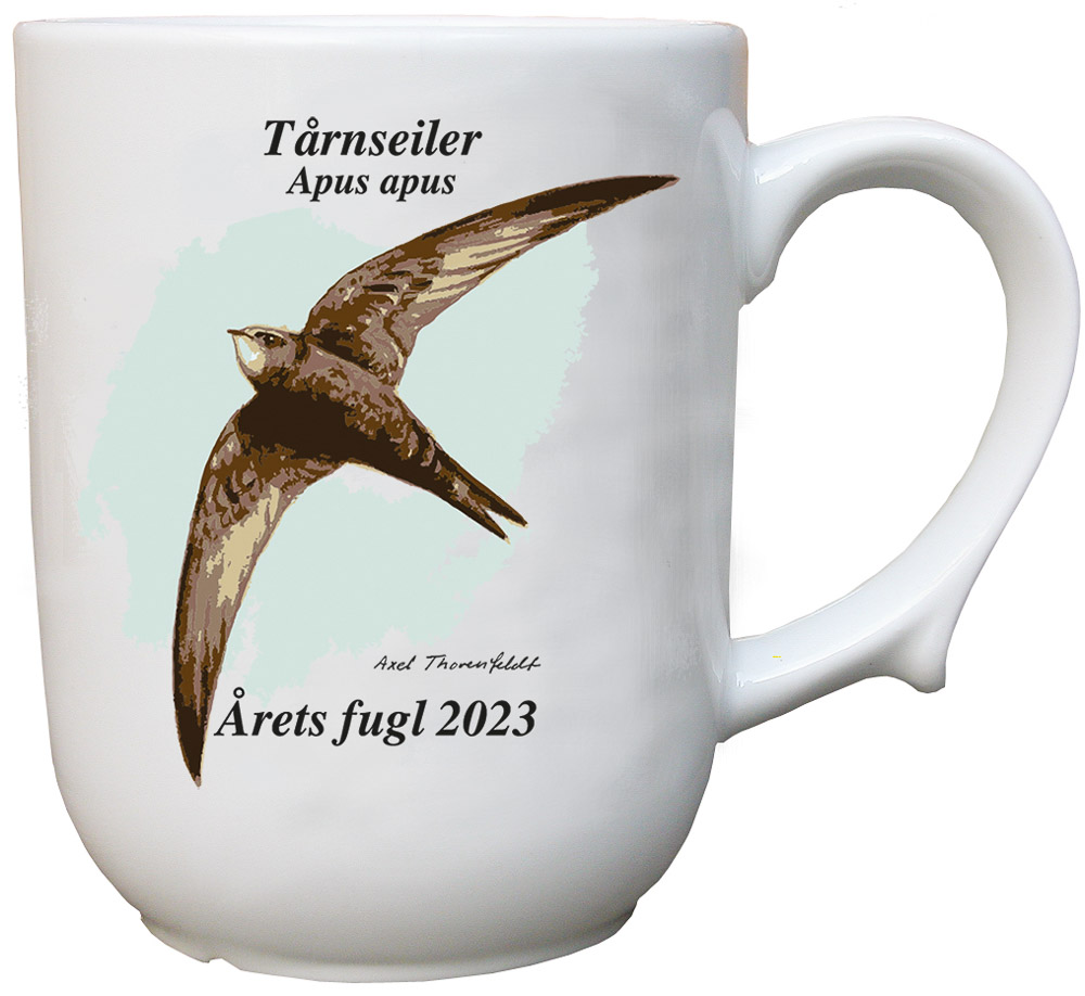 Kvalitetskrus fra Figgjo porselen. Motiv tegnet av Axel Thorenfeldt. Tårnseiler er valgt til Årets Fugl i 2023 av BirdLife Norge (Bildet viser «prøvetrykk» ikke originalt krus.)
